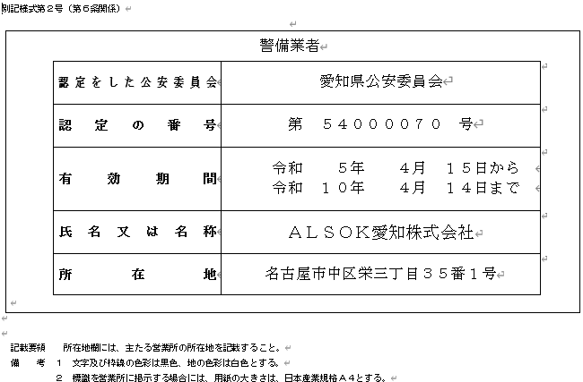 ニュース 2026年4月1日 重要 警備業標識の変更 このたび、中京綜合警備保障株式会社は4月1日付で「ALSOK愛知株式会社」に商号変更を行ったことに伴い、警備業標識を変更しました。 新着ニュース 警備業標識の変更 会社合併・社号変更に関するお知らせ 「社会福祉法人 日本介助犬協会」様開催の介助犬講習会に協賛しました 2026年シーズン プロ野球イベント警備アルバイトスタッフ採用を開始しました 2026年 新年のご挨拶 カテゴリー お知らせ採用情報重要 年別アーカイブ 2026 2025 2024 2023 2022 2021